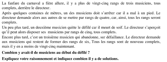 - Comprendre que si les rangs de 3, puis 4, puis 5, et puis 6 sont tous complets, le nombre total de musiciens restants est successivement, un multiple de 3, de 4, de 5 et de 6 et que, simultanément, les séquences cherchées se composent de quatre nombres consécutifs, dans l’ordre décroissant.