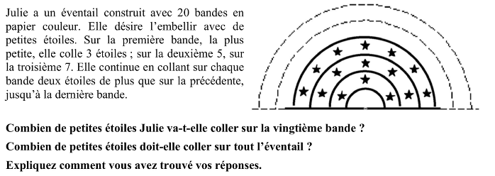Ou : Dessiner tout l’éventail (les 20 bandes) avec toutes les étoiles, puis compter celles de la dernière bande et celles de tout l’ensemble.
