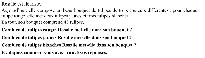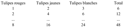 - Imaginer que le bouquet peut se décomposer en petits bouquets comprenant six tulipes (1 rouge, 2 jaunes, 3 blanches) et qu’il y a 8 de ces petits bouquets (48 : 6 = 8), et donc qu'il y a 8 rouges, 16 jaunes et 24 blanches.