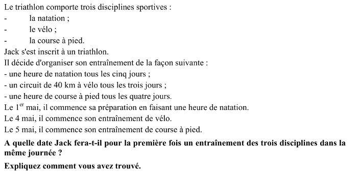 Déterminer la date à laquelle un sportif s'entraînera à la fois à la natation, au vélo et à la course à pied, sachant qu'il s'entraîne à la natation tous les 5 jours à partir du 1 mai; qu'il s'entraîne au vélo tous les trois jours à partir du 4 mai et qu'il s'entraîne à la course à pied tous les quatre jours à partir du 5 mai.