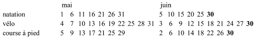 Ou : Noter les dates des entraînements de chaque discipline, pour chaque mois et chercher la première coïncidence.