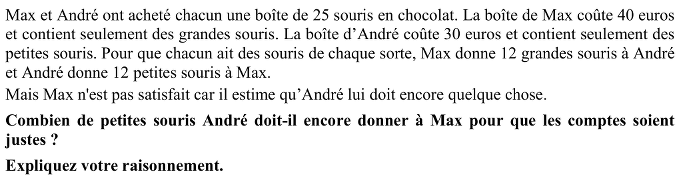 - On peut calculer le prix unitaire des souris par des divisions par 25 (1,60 € les grandes et 1,20 € les petites) et en déduire la valeur des nouvelles boîtes : 13 x 1,60 + 12 x 1,20 = 35,20 € pour celle de Max et 12 x 1,60 + 13 x 1,20 = 34,80 € pour celle d’André. Ce dernier, dont la boîte initiale coûtait 30 €, doit donc 4,80 € à Max., ce qui représente 4 petites souris.
