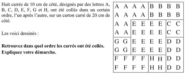 Déterminer l'ordre d'empilement de 8 carrés de 10 cm de côté, chacun orné d'un motif différent, connaissant la figure finale obtenue, un carrée de 20 cm de côté.