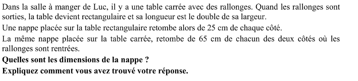 Ou : par algèbre, en ayant désigné par x la mesure du côté de la table, en cm, on écrit l’équation 2x + 50 = x+130, qui a comme solution 80 ; on obtient ainsi les mesures des côtés de la nappe (80 + 50 = 130 et 160 + 50 = 210).