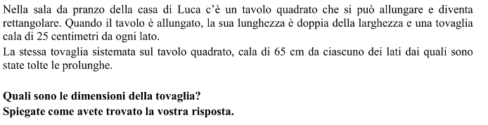 Oppure, senza utilizzare un disegno: rendersi conto che l’allungamento totale di 80 cm (2 x (65 – 25))cm corrisponde al lato del «quadrato aggiunto» con le prolunghe e dunque al lato del tavolo di base e dedurre le dimensioni del tavolo allungato, poi quelle della tovaglia. Oppure: per via algebrica, avendo indicato con x la misura del lato del tavolo quadrato, in cm , si scrive l’equazione 2x + 50 = x+130, che ha a come soluzione 80; si ottengono poi le misure dei lati della tovaglia (80 + 50 = 130 e 160 + 50 = 210).