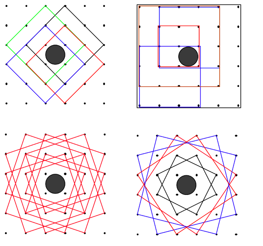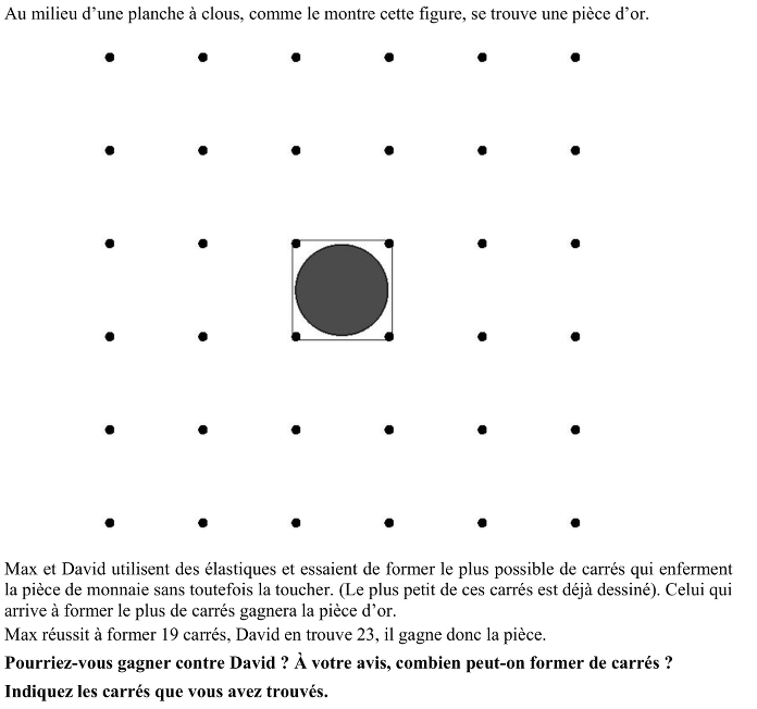 Former le plus grand nombre de carrés sur une planche à clous (carré avec 6 clous de côté de telle manière que ces carrés entourent une pièce posée dans le carré central.