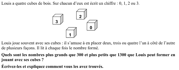 - Se rendre compte que parmi les nombres de trois chiffres les seuls que Louis peut former avec ses cubes ont le chiffre 3 pour les centaines et que, par conséquent, il ne reste de disponible que les cubes 2, 1 et 0.