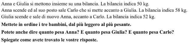 - Dalle prime due informazioni, comprendere che allo scambio tra Anna e Carlo corrisponde un aumento di peso, da 50 a 58 kg, ciò significa che Carlo è più pesante di Anna di 8 kg. Dalla seconda e dalla terza informazione, comprendere che, quando Anna sostituisce Giulia, il peso diminuisce da 58 a 52 kg, cosa che significa che Anna è più leggera di Giulia di 6 kg (con uno stesso ragionamento, dalla prima e dalla terza informazione, si trova che Carlo è più pesante di Giulia di 2 kg)