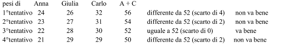 - Arrivare così alla seriazione dei pesi: Anna < Giulia < Carlo,o con valori numerici: A - Senza tener conto della seriazione precedente, effettuare dei tentativi ed organizzarli. Per esempio, partendo da 24 e 26, la cui somma è 50, per i pesi di Anna e Giulia, calcolare il peso di Carlo per differenza a partire da C + G = 58, poi verificare la somma dei pesi di Anna e Carlo: