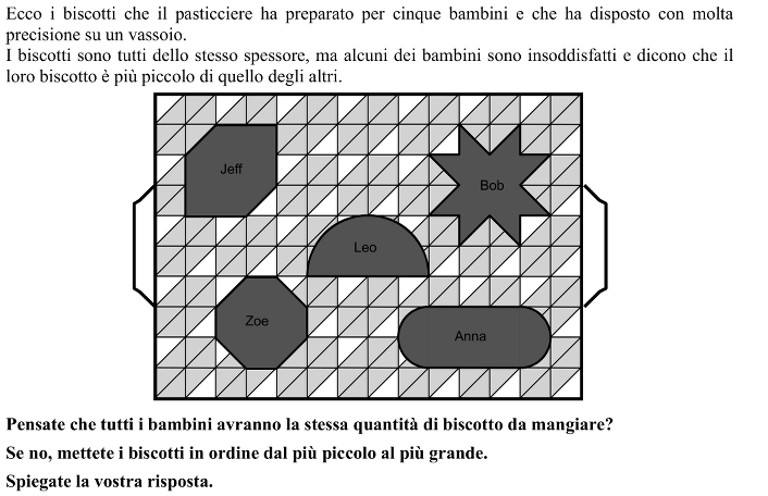 - Individuare la grandezza in gioco per trovare la parte di biscotto di ognuno : scartare gli angoli (la forma), il numero di lati o di vertici e il perimetro; optare per l’area delle figure (o il volume, visto che i biscotti hanno tutti lo stesso spessore)
