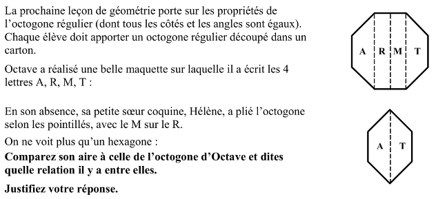 - Voir que l’aire de l’hexagone d’Hélène est la moitié de celle de l’octogone d’Octave.