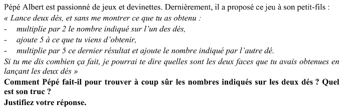 Ou, de manière rhétorique : considérer que multiplier par 5 « le double du premier nombre augmenté de 5 » est équivalent à « 10 fois le premier nombre augmenté de 25 » et le résultat donné par le petit-fils sera donc égal à « 10 fois le premier nombre augmenté de 25 augmenté du second nombre ». Pépé n’aura plus qu’à enlever 25 pour arriver à « 10 fois le premier nombre augmenté du second nombre ». Même conclusion que précédemment