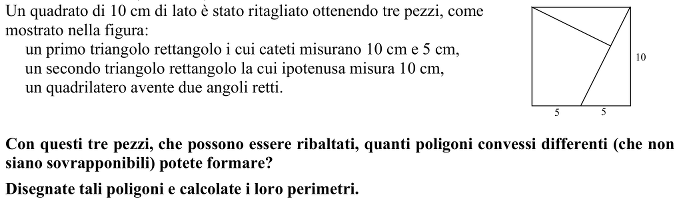 Un quadrato di 10 cm di lato è suddiviso in tre pezzi: due triangoli rettangoli (cateti di lunghezze 10 e 5 per uno e ipotenusa di 10 cm per l'altro) e un quadrilatero di cui un lato è noto (59). Disegnare tutti i poligoni convessi che si possono formare con questi tre pezzi e calcolare il loro perimetro.