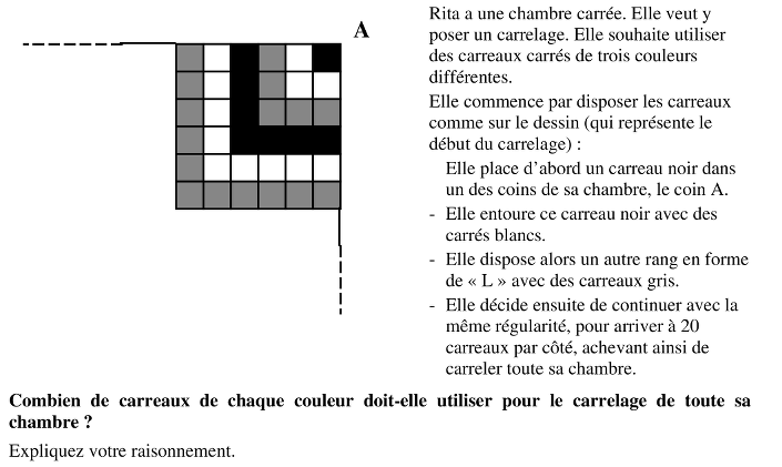 - Observer dans la figure la disposition des diverses couleurs et déterminer les critères de succession permettant, à chaque fois qu’on ajoute un rang de carreaux en « L », de former des carrés de plus en plus grands jusqu’à arriver à celui du carrelage complet de (20 x 20).