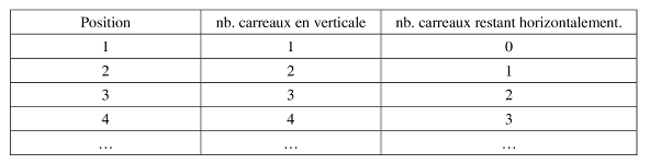 on trouve les noirs à partir de A (position 1) de 3 en 3 rangs, les blancs et les gris vont aussi de 3 en 3 rangs, en partant respectivement de la 2e et de la 3e case. (positions 2 et 3). Les carreaux de chaque rang en « L » peuvent être comptés verticalement et horizontalement (sans compter deux fois celui de l’angle). Ces nombres progressent ainsi, selon le tableau suivant :