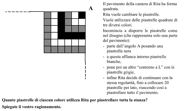 Per ricoprire un quadrato, si alternano in “strisce" a forma di L nere, bianche e grigie, partendo con un quadratino nero nell’angolo a destra in alto. Trovare il numero dei quadratini di ogni colore sapendo che ci sono 20 “strisce”.
