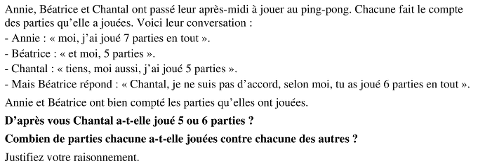 - Puisque que la somme de deux nombres impairs est un nombre pair, et que la somme d’un nombre pair et d’un nombre impair est impaire, voir la contradiction dans le compte de Chantal : si elle n’avait joué que 5 parties, les trois filles auraient joué au total 17 parties, soit un nombre impair, ce qui est impossible. Chantal a donc joué 6 parties et il y a donc 18 parties jouées en tout.