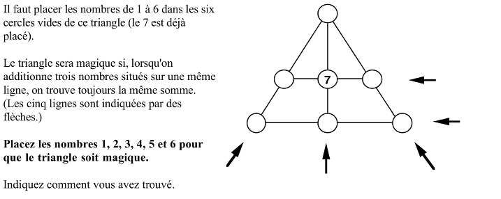Disposer les nombres de 1 à 7 sur les 3 sommets, les 3 milieux de côté et le centre d’un triangle, de manière que la somme des nombres sur les trois côtés, sur une médiane et sur un segment reliant deux milieux de côtés et le centre soit la même.
