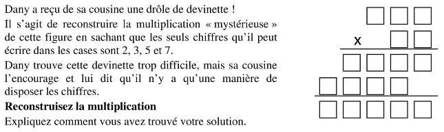 - Vérifier d'abord systématiquement les produits des unités et constater que seuls cinq couples sont possibles (3 ; 5), (5 ; 3) (5 ; 5), (5 ; 7), (7 ; 5). Les autres couples conduisent en effet à un chiffre des unités dans le premier produit qui n'est pas sur la liste autorisée, comme : 7 x 3 = 21 donnerait 1 au chiffre des unités.