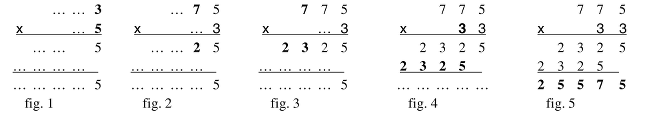 - Essayer ensuite (5 ; 3). Le chiffre des dizaines du premier facteur ne peut être que 7 selon le raisonnement précédent et qui conduit à 2 comme chiffre des dizaines du premier produit partiel. (fig. 2)