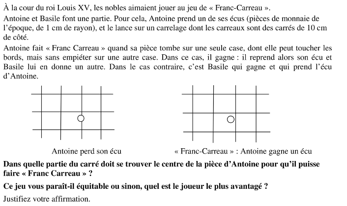 -Déterminer le domaine où doit tomber le centre de l’écu, de 1 cm de rayon, pour faire « Franc-Carreau » : un carré dont les côtés sont à 1 cm de distance de ceux du carreau, à l’intérieur, c’est-à-dire, vu que les carreaux ont 10 cm de côté, le carré intérieur devra avoir 8 cm de côté et le même centre que le carreau. (D’après la donnée, si le centre se trouve sur un côté de ce carré intérieur, la pièce touche le côté du carreau sans empiéter sur un autre et le « Franc- Carreau » est valable)