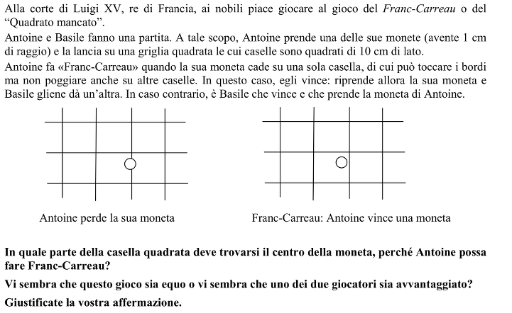 Trovare in quale parte di un quadrato di lato 10 cm deve trovarsi il centro di un cerchio di raggio 1 cm in modo tale che la circonferenza non sia secante con i lati del quadrato. Trovare inoltre la probabilità di rispettare le condizioni date.