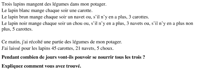 Trouver le nombre de jours qu'un certains nombre de légumes permettent de nourrir trois lapins aux régimes alimentaires divers.