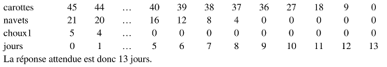 - La démarche la plus probable et la plus efficace est de faire un inventaire jour après jour, ou par tranches de temps jusqu’à épuisement d’un des légumes, en tableau ou du genre :