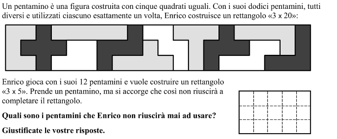 PentaminiIdentificazioneRally: 13.I.10 ; categorie: 5, 6, 7 ; ambito: GPEnvoyer une remarque ou une suggestion SuntoIndicare i pentamini che non possono essere utilizzati per costruire un rettangolo 3 x 5. Enunciato![]() RisultatiI risultati non sono stati salvati o non sono ancora disponibili. |