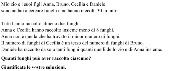 Determinare il numero di funghi raccolti da 5 persone, conoscendo il numero totale (30) e delle informazioni parziali sul raccolto di ciascuno.
