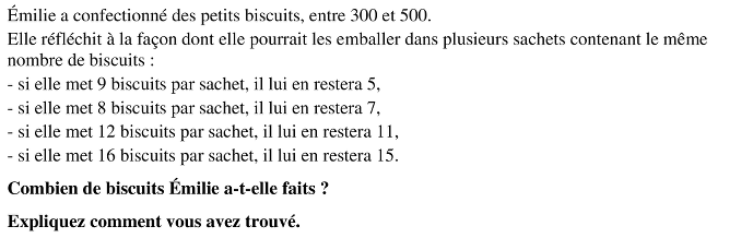 - Se rendre compte que x+1 est multiple de 8, 12 et 16, c’est-à-dire de 48. Chercher, parmi les multiples de 48 compris entre 300 et 500 (336, 384, 432, 480) celui qui, lorsqu’on lui enlève 1, donne un reste de 5 par une division par 9 (335:9 = 37 r=2, 383:9 = 42 r=5, 431:9 = 47 r=8, 479:9 = 53 r=2) et trouver ainsi 383.