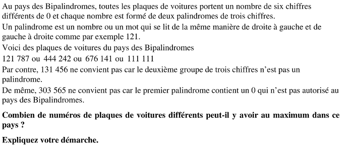 - Comprendre que, comme chacun des palindromes de la 2e partie du nombre peut figurer également comme première partie du nombre, on a comme solution au problème posé : 81x 81= 6561 plaques différentes.