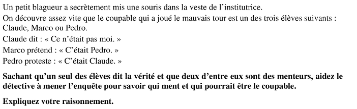 - En déduire que les seules certitudes sont que Marco ment et que Pedro ne peut être coupable.