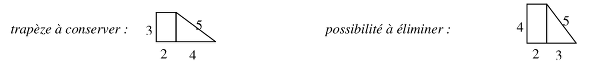 - Déterminer la petite base du trapèze : à partir du périmètre du triangle, 3 + 4 + 5 = 12, constater qu’il faut compléter la figure par un rectangle de 2 cm de largeur pour obtenir un trapèze de 16 cm de périmètre. En conclure qu’il y a deux trapèzes possibles et (mesures : 2 ; 3 ; 6 ; 5 et 2 ; 4 ; 5 ; 5) et qu’il faut éliminer le second puisque les mesures des côtés du trapèze doivent être différentes :