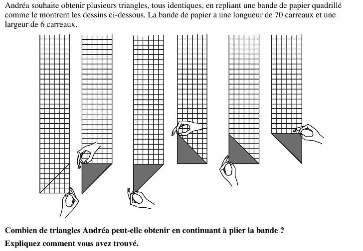 Comprendre le pliage proposé et dénombrer le nombre de triangles (rectangles isocèles de petits côtés 6 carreaux) dans un bande de dimension 6 x 70 carreaux.