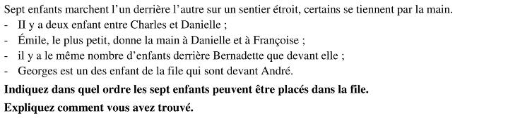 Ordonner sept enfants dans une file étant données quatre assertions concernant des ordres partiels.