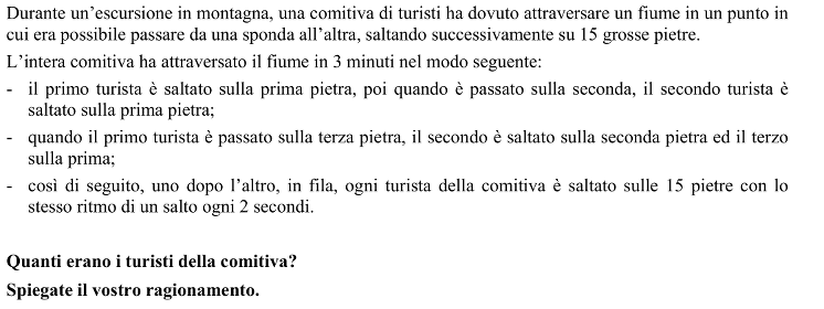 Trovare il numero di turisti in un gruppo sapendo il modo e il tempo (3 minuti) impiegato per attraversare un fiume saltando uno dopo l'altro successivamente su 15 grandi pietre al ritmo di un salto ogni 2 secondi.