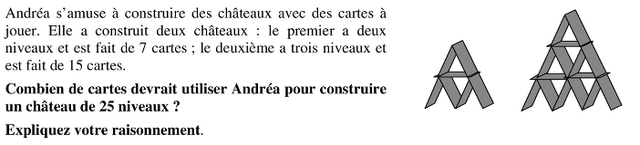 et comprendre que pour passer d’un château au château suivant, il faut ajouter un nombre de cartes égal à la différence entre les nombres de cartes des deux niveaux précédents augmenté de trois :
