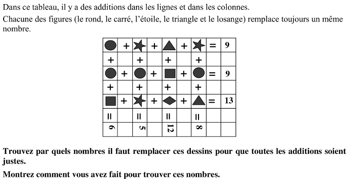 - Arriver enfin à la solution : rond : 3 , carré : 0, étoile : 1, triangle : 4, losange : 8.