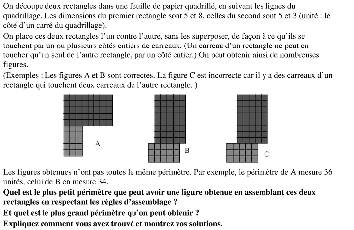 Juxtaposer deux rectangles quadrillés (dimensions 3 x 5 et 5 x 8) en respectant l'alignement des quadrillages de telle manière à ce que le périmètre de la figure obtenue soit maximum.
