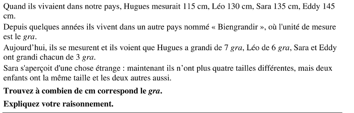 Donner la valeur de l'unité de longueur le gra (en cm) sachant que quatre enfants de grandeurs 115, 130, 135 et 145 (cm) en quelques années ont grandit de, respectivement, 7, 6, 3 et 3 (en gra) et qu'actuellement les enfants 2 par 2 ont la même taille.