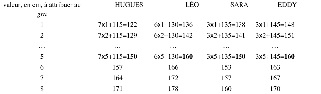Dans la seconde hypothèse, la différence de 5 cm (135 – 130 entre Sara et Léo serait compensée par une différence de 3 gra (6 – 3), ce qui donnerait 5/3 cm pour 1 gra, et la différence de 30 cm (145 – 115) entre Eddy et Hugues serait compensée par la différence de 4 gra (7 – 3), ce qui donnerait 7,5 cm pour 1 gra, en contradiction avec la précédente.