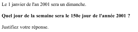 Le 1 janvier d’une année étant un dimanche, déterminer le jour de la semaine du 150e jour de cette année.