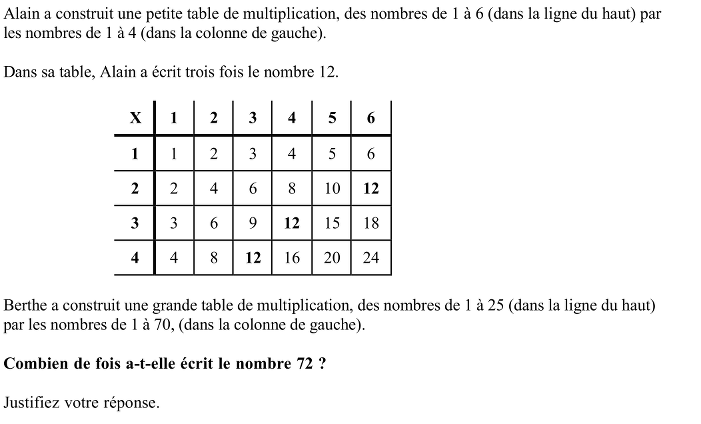 - Trouver les 9 produits égaux à 72 figurant dans la table : (2 x 36, 3 x 24, 4 x 18, 6 x 12, 8 x 9, 9 x 8, 12 x 6, 18 x 4 et 24 x 3)