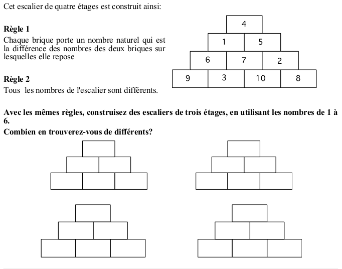 Trouver les pyramides de briques de trois étages (3 ; 2 ; 1) complétées avec les nombres de 1 à 6 telles que chaque brique porte un nombre naturel qui est la différence des nombres des deux briques sur lesquelles elle repose.