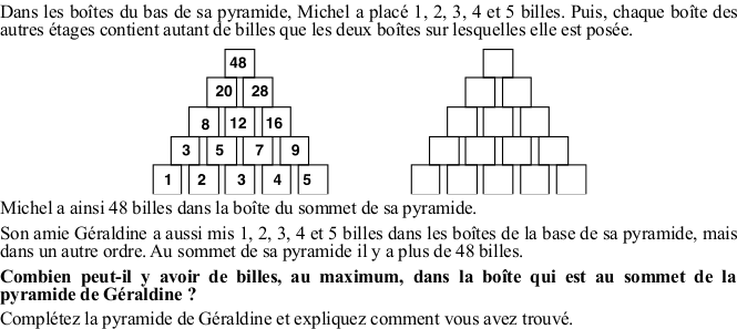 Trouver la disposition des cinq nombres 1, 2, 3, 4, 5 dans les cinq cases de la base d'une "pyramide additive de nombres" de cinq étages, qui donne le plus grand nombre au sommet. La règle de construction de la pyramide est que chacun de ses nombres est la somme de ses deux voisins de l'étage inférieur.