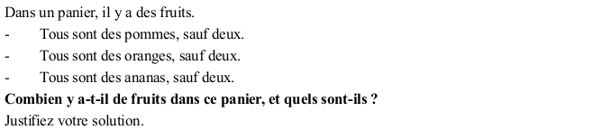 Trouver le nombre de fruits contenus dans un panier connaissant pour chacun des trois fruits le nombre de fruits des deux autres sortes.