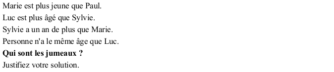 Trouver qui sont les deux jumeaux parmi quatre enfants dont, pris deux à deux, on connaît des relations entre leur âge.