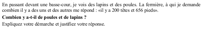 Trouver le nombre de poules et le nombre de lapins sachant qu'il y a en tout 200 têtes et 656 pieds.