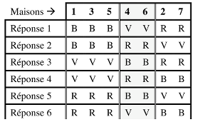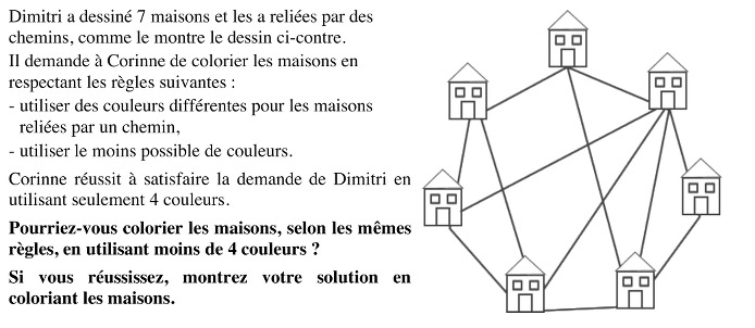 Ou bien colorier une maison et repérer celles qui peuvent être éventuellement coloriées de la même couleur ou celles qui sont nécessairement d’une autre couleur. Continuer de la même manière en vérifiant à chaque étape que la contrainte est vérifiée.